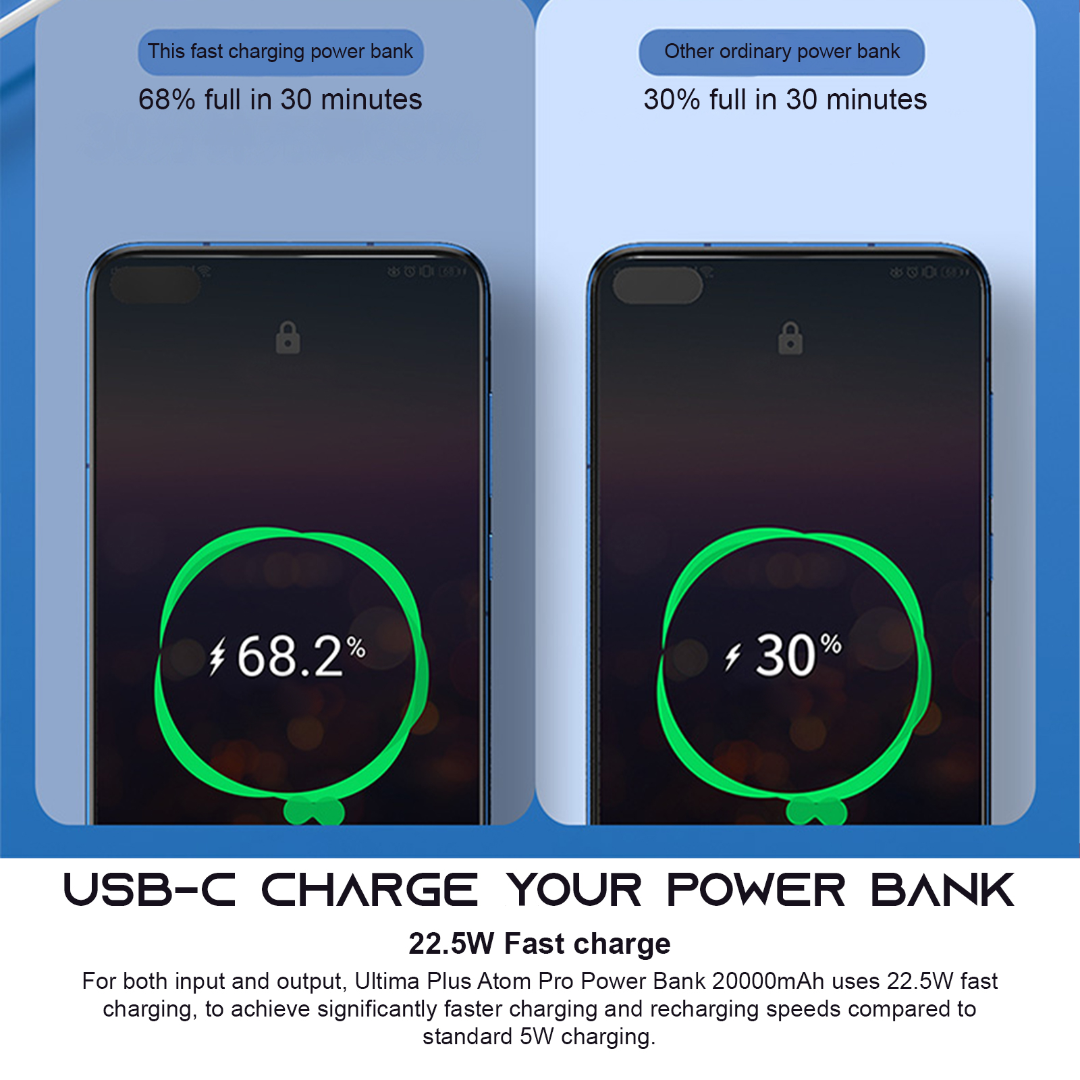 2 Ports 22.5W Input: Micro-USB & USB-C (PD) input ports support 18W fast input & fully charge itself in 2 hours. Type-C cable included.
